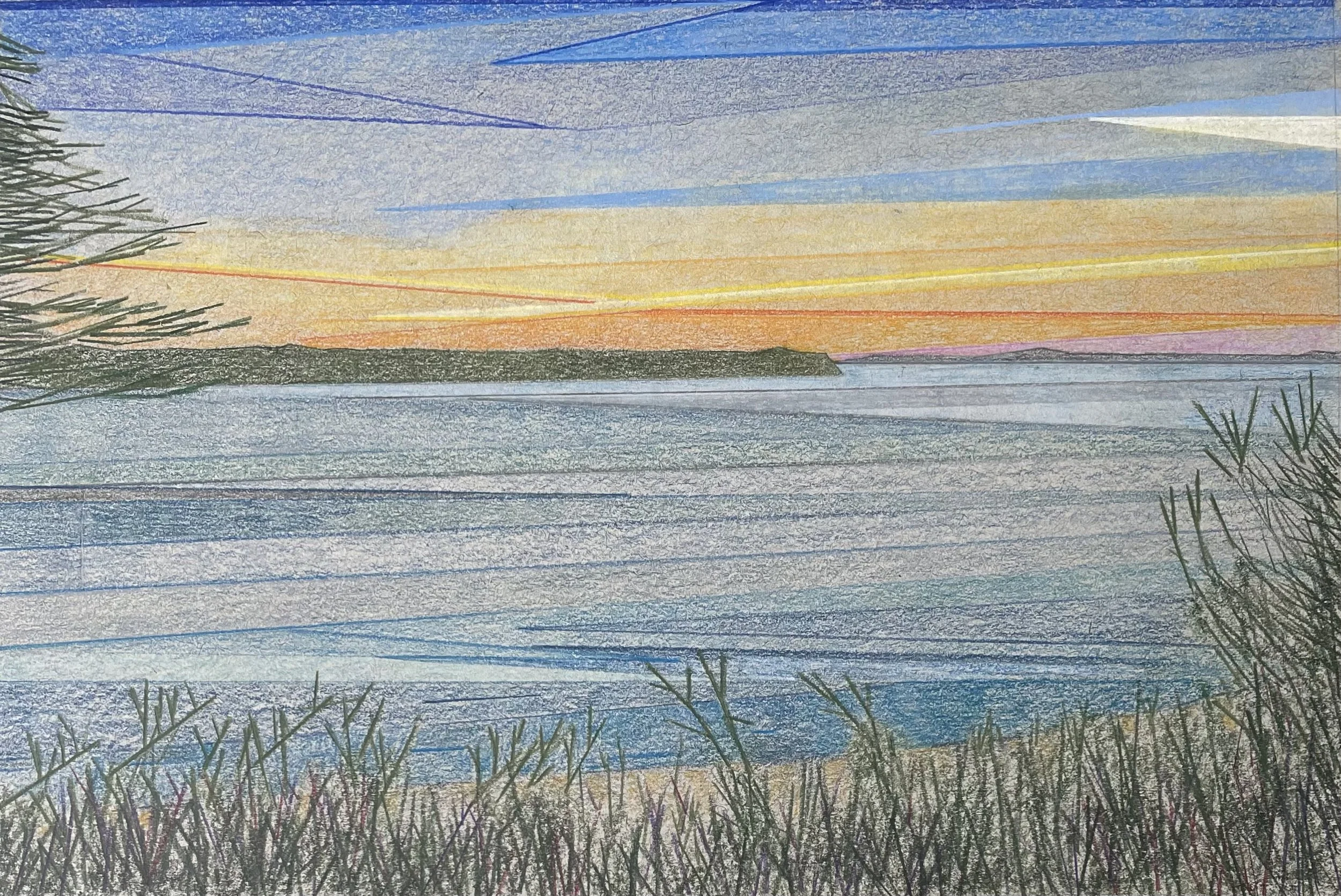 I am an artist primarily drawing on paper and I especially enjoy experimenting with how line and colour come together in small to medium scale seascapes and landscapes.